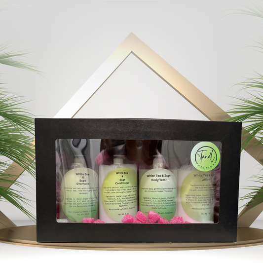 Discover the ultimate hydration experience with our White Tea & Sage Complete Body Care Set. This all-in-one solution includes a rejuvenating shampoo, nourishing conditioner, refreshing body wash, and luxurious lotion. Enriched with white tea and sage, our formulas deeply hydrate and moisturize your skin and hair, leaving them soft, smooth, and radiant. Elevate your self-care routine and indulge in the refreshing benefits of nature. Shop now for the perfect addition to your daily regimen!